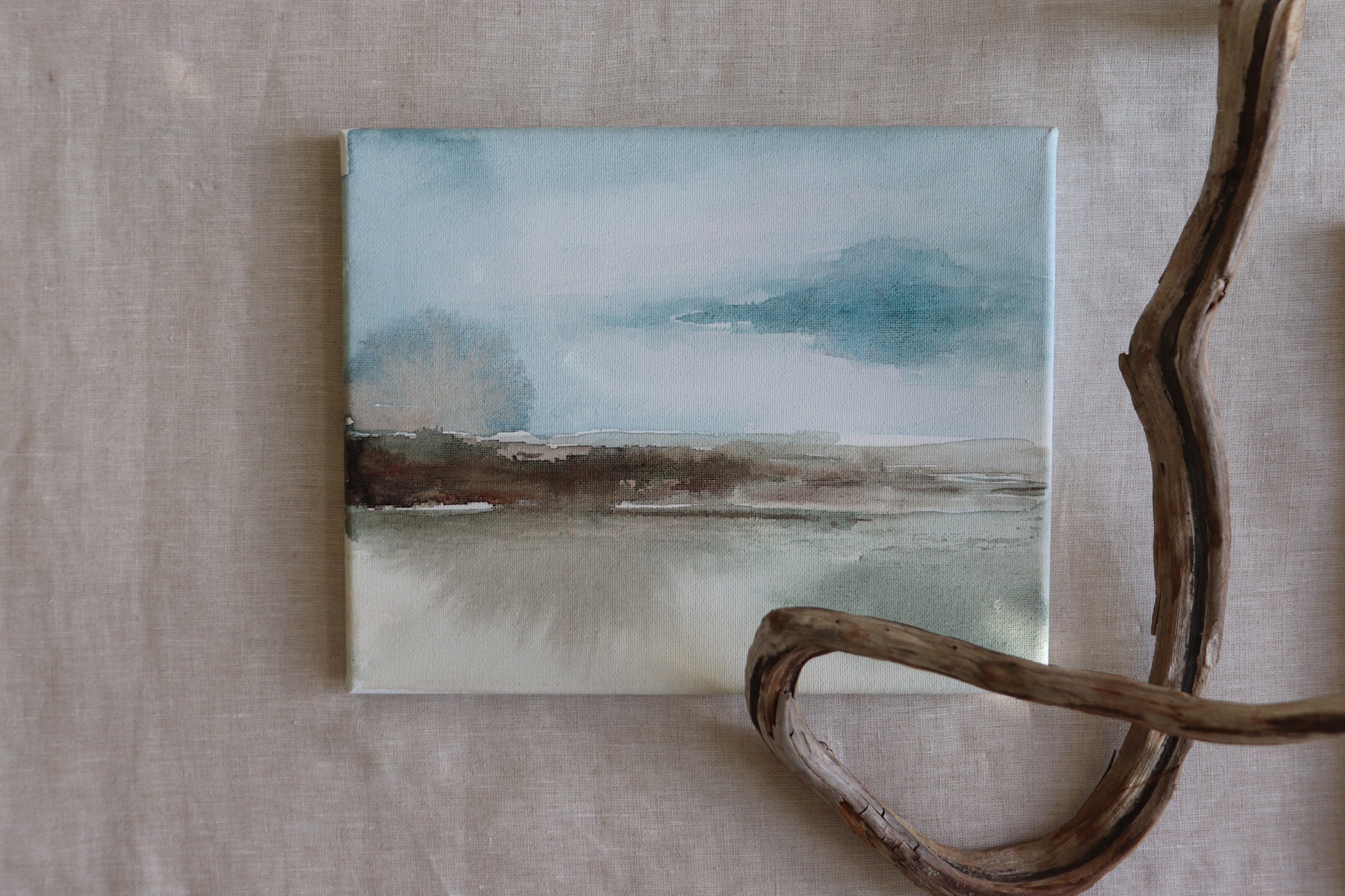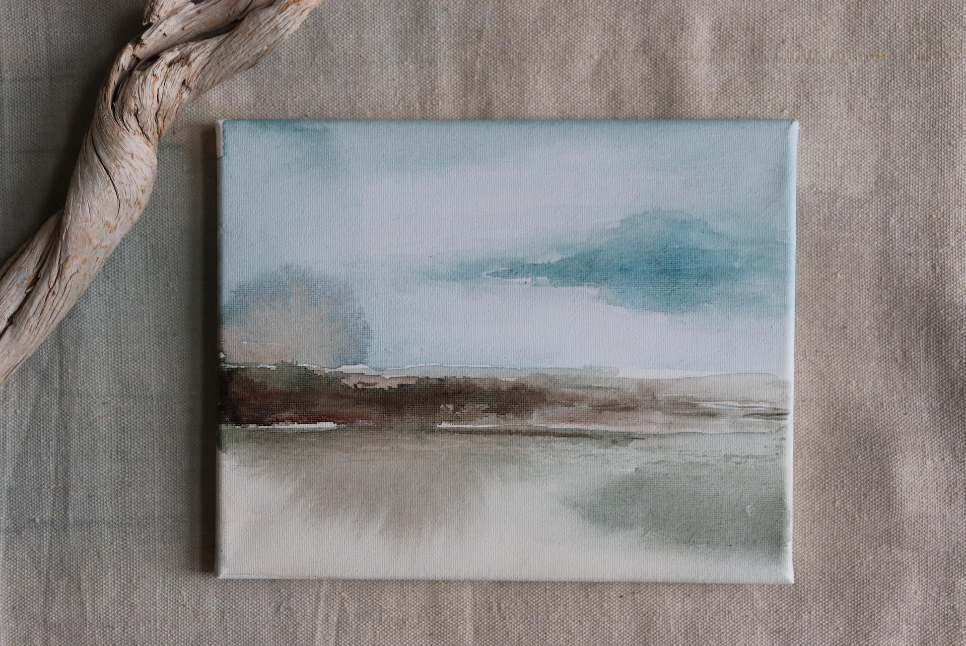 This abstract painting features a calm, neutral landscape-inspired look that creates an instant sense of stillness and rest.