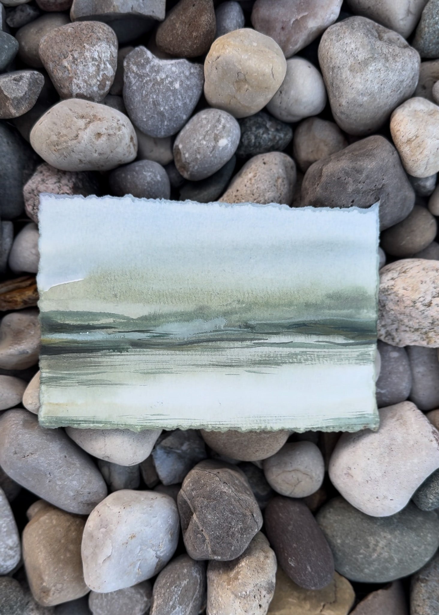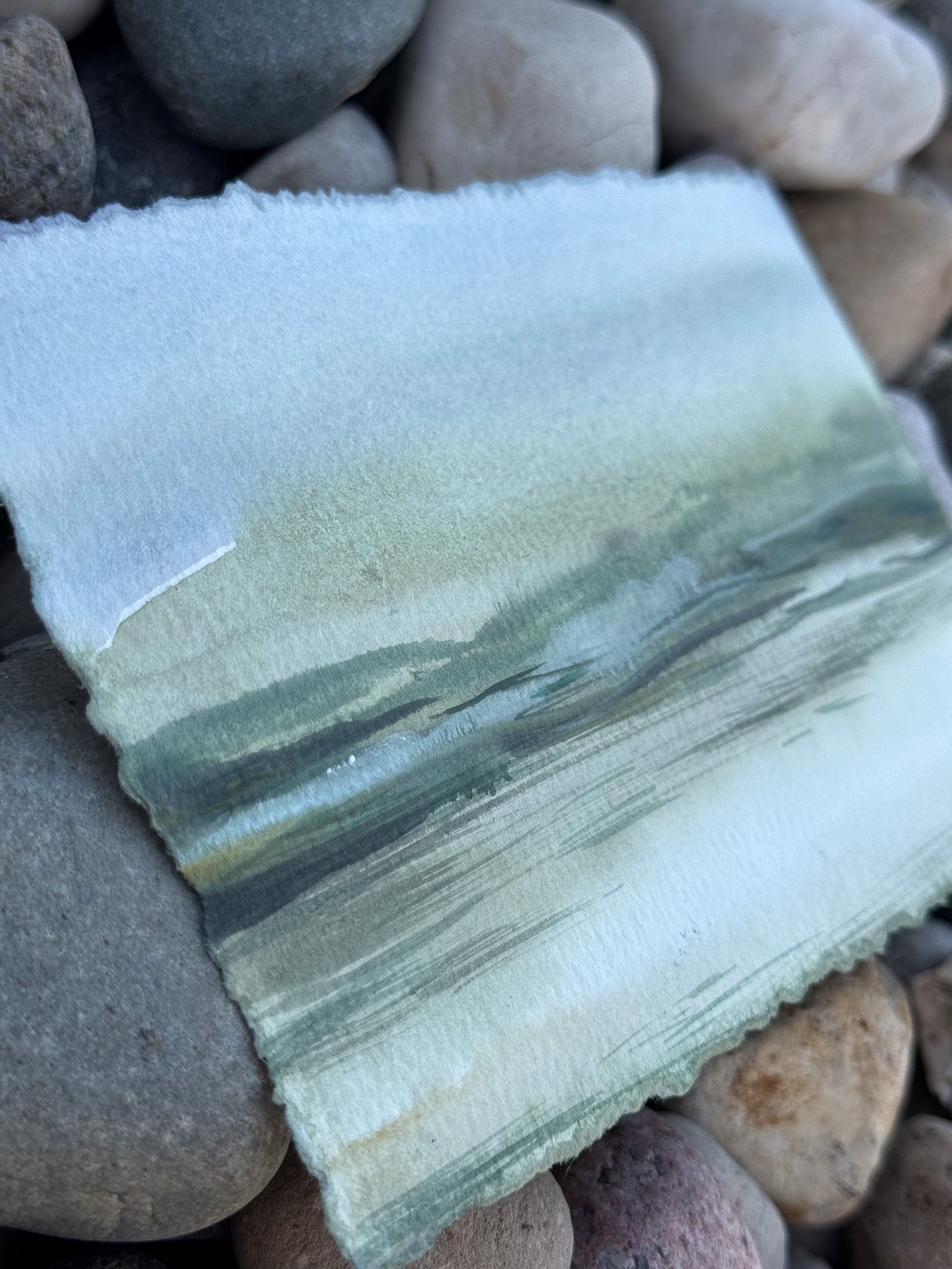 Painted using water from the lake, this piece has a special connection to its serene inspiration. The deckle-edge paper adds a touch of rustic charm, making it a perfect addition to any art collection.