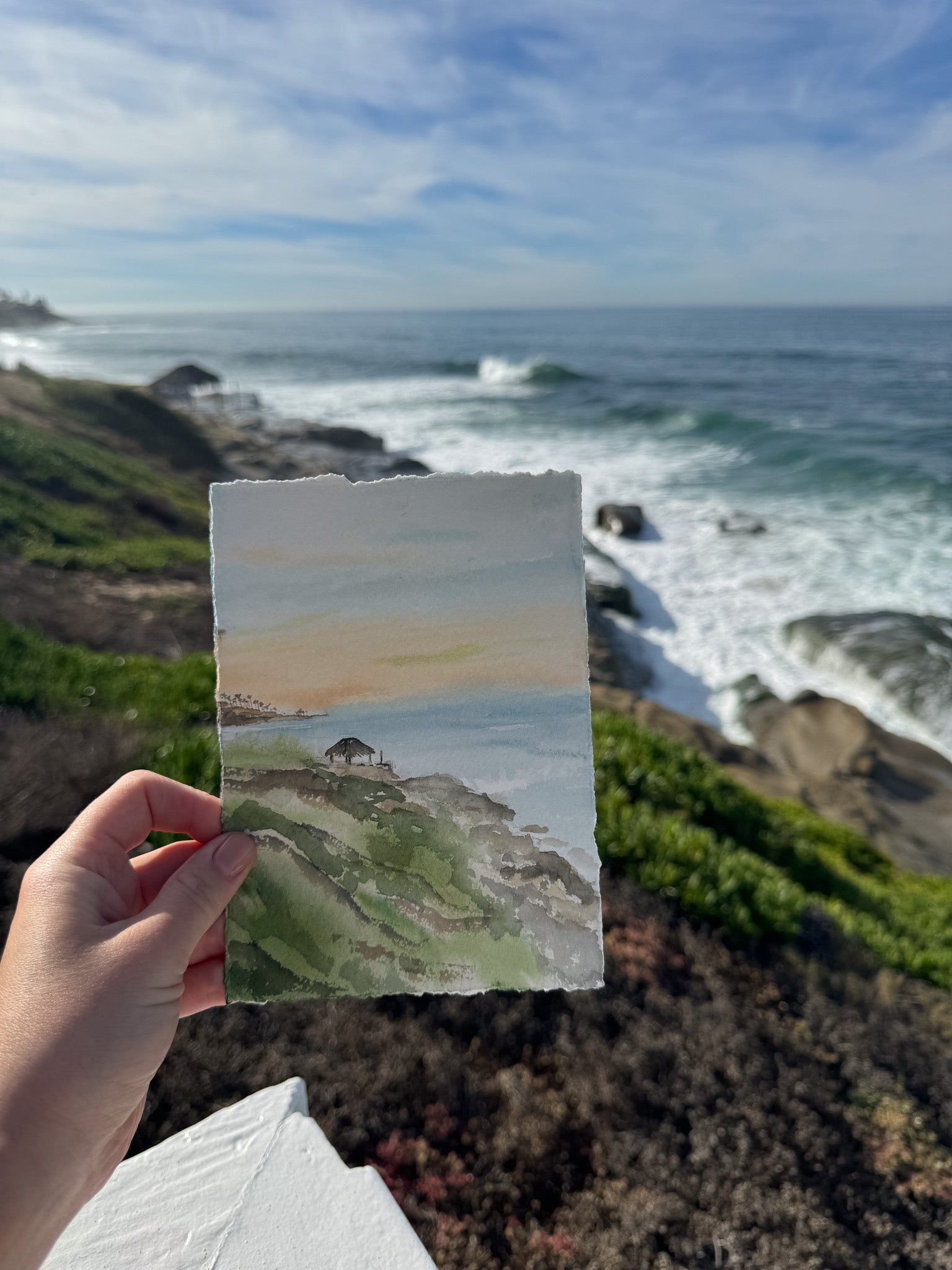 Step into coastal bliss with this captivating watercolor painting, where I was inspired by the iconic Windansea Beach Shack. Soft blues evoke the ocean's gentle dance, while hints of sunrise peach in the sky add warmth. The dynamic composition invites you to embrace the tranquil allure of this beloved spot. Let the soothing colors transport you to the peaceful rhythm of the coast, infusing your space with maritime magic.